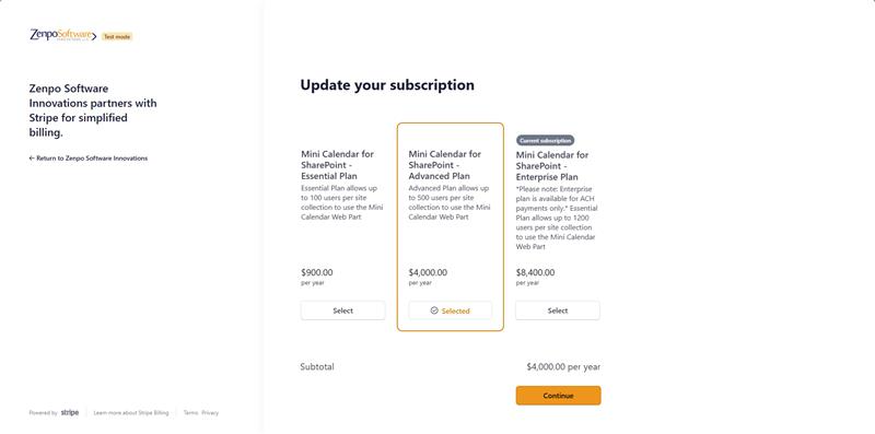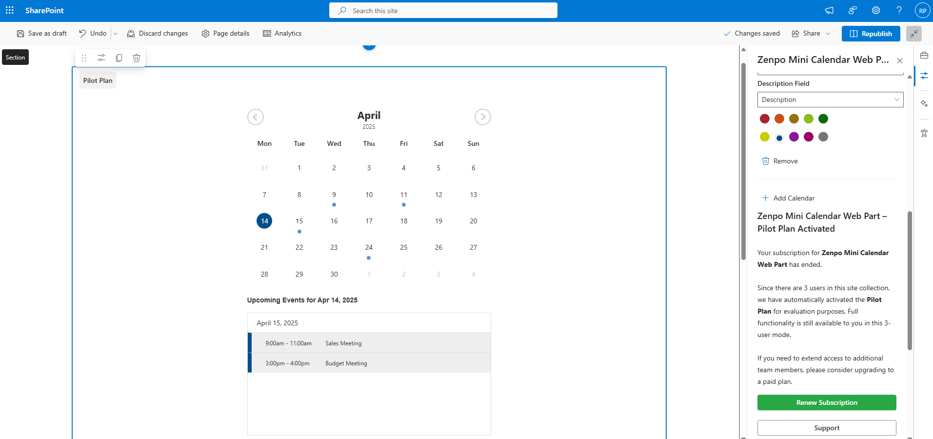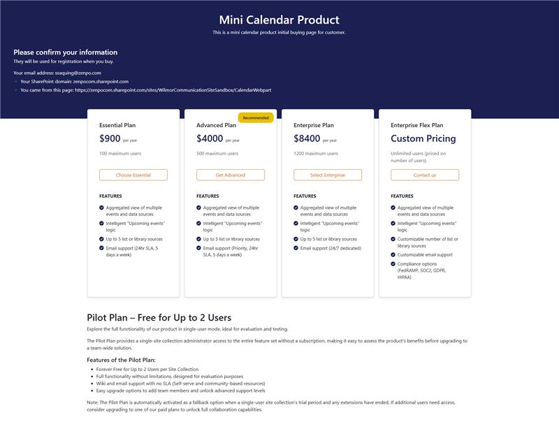 The Mini Calendar Web Part includes a Pilot Plan designed for small teams. If your SharePoint site collection has 3 or fewer users, the web part will continue to function even if the subscription has expired. This setup is ideal for lightweight use cases or long-term evaluation